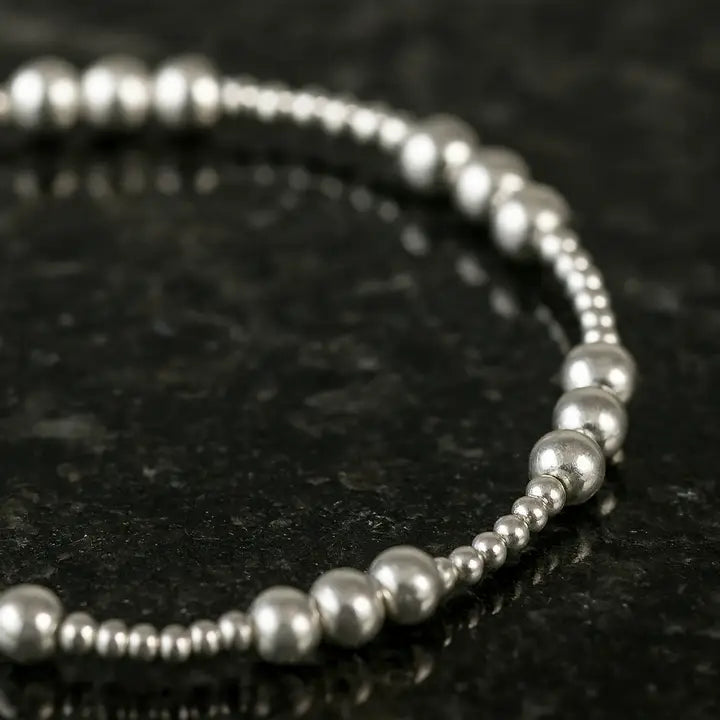 Elegant and timeless, this sterling silver beaded bracelet is crafted with alternating polished spheres that catch the light beautifully with every movement. The sleek design features a balanced mix of delicate micro-beads and slightly larger accent beads, arranged in a perfectly circular form for a modern, minimalistic look. Lightweight and versatile, this bracelet can be worn solo for a touch of understated sophistication or stacked with other pieces for a bold, layered style. Its stretch design ensures a comfortable fit, making it suitable for everyday wear or special occasions.