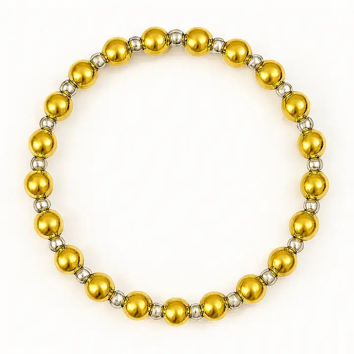 Elevate your everyday style with this refined beaded bracelet featuring perfectly polished 5mm gold beads paired with sleek 3mm silver accent beads. Each bead is flawlessly smooth and mirror-finished, creating a luxurious, high-end shine that catches light from every angle. Designed for both elegance and versatility, this bracelet offers a modern two-tone aesthetic that complements any outfit—whether casual, professional, or formal. The alternating bead sizes add subtle visual rhythm and sophistication, making it an ideal accessory for stacking or wearing solo.