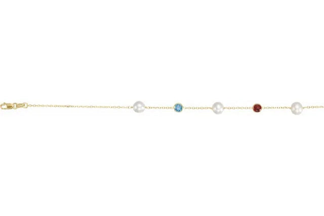 Gracefully designed, this 14K yellow gold station necklace features luminous 6mm cultured pearls paired with bezel-set semi-precious gemstones. The delicate arrangement creates a timeless look, blending classic beauty with a touch of vibrant color—perfect for layering or wearing solo.